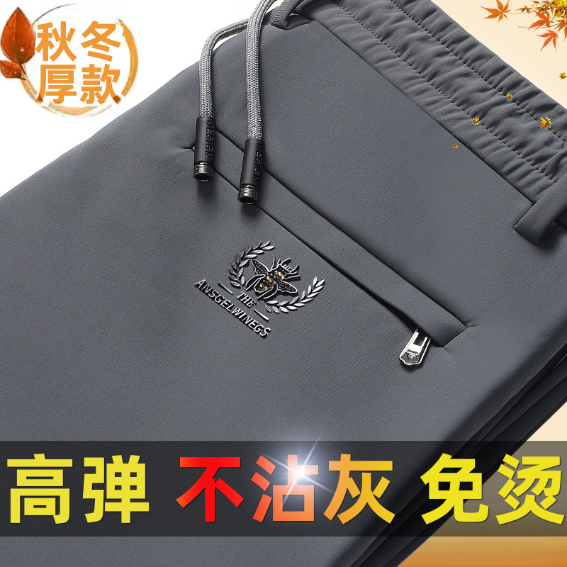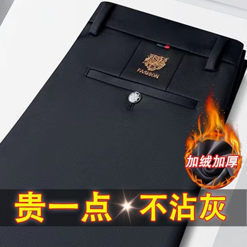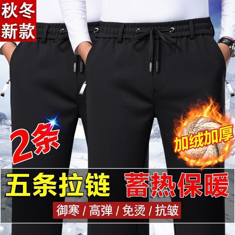 ベルベットの厚い高級弾力カジュアルパンツ男性秋冬の厚いタイプの中年ビジネスストレート高腰の熱いズボン