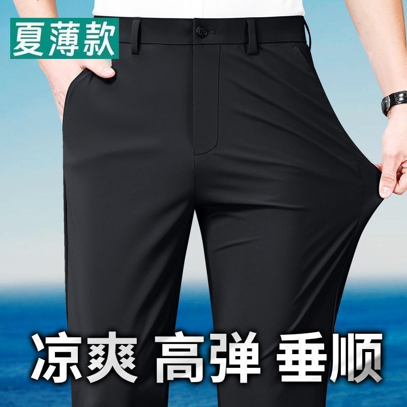 夏の薄い新しいメンズストレートルーズストレッチカジュアルパンツビジネスノンアイロンパンツ中高年アイスシルクパンツ