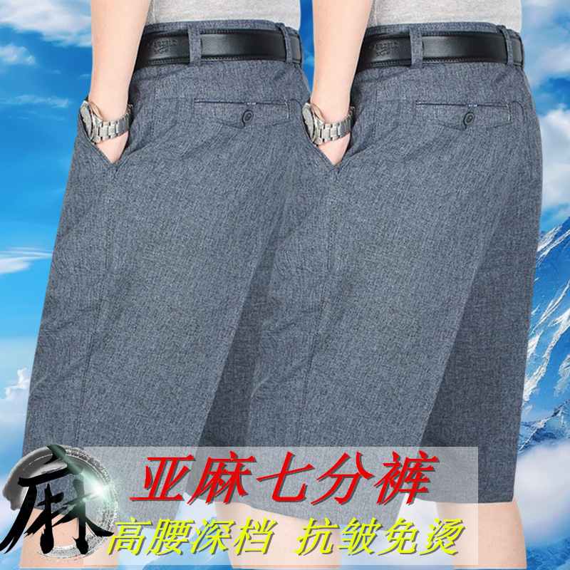 夏リネンショーツお父さんメンズゆったり中高年アイスシルク5点パンツゆったりストレートビジネスカジュアルパンツ