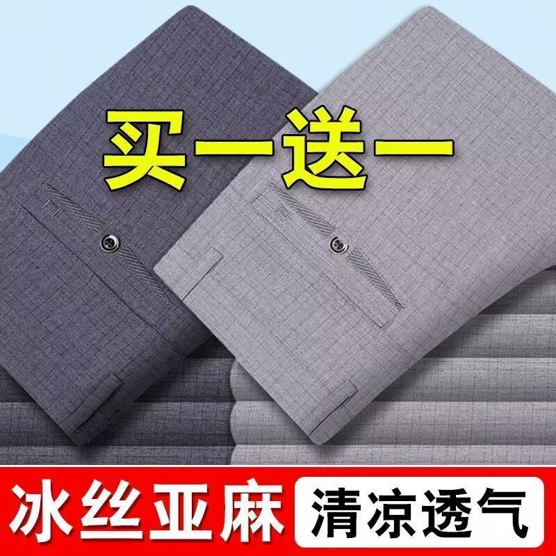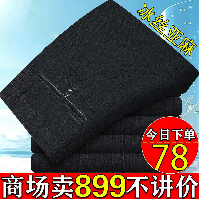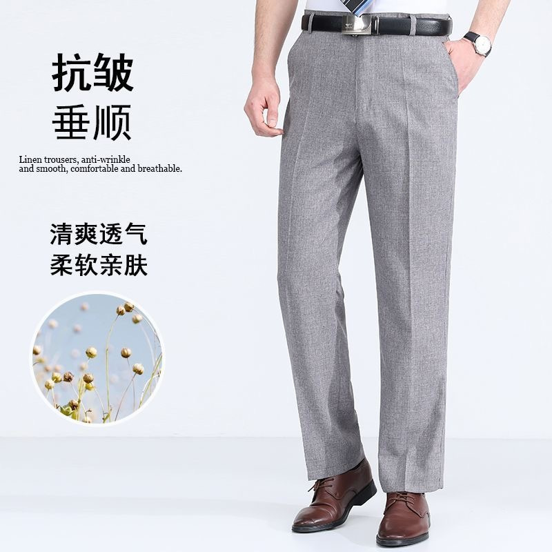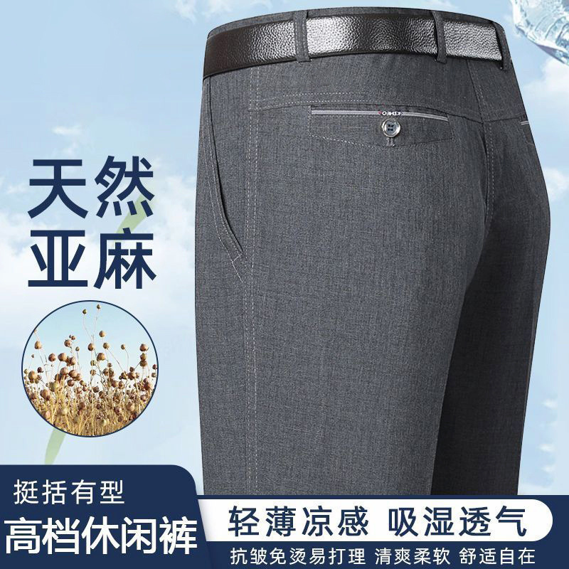 夏用薄手メンズアイスシルクリネン中高年カジュアルパンツノンアイロンパンツゆったり綿麻ストレートメンズパンツ