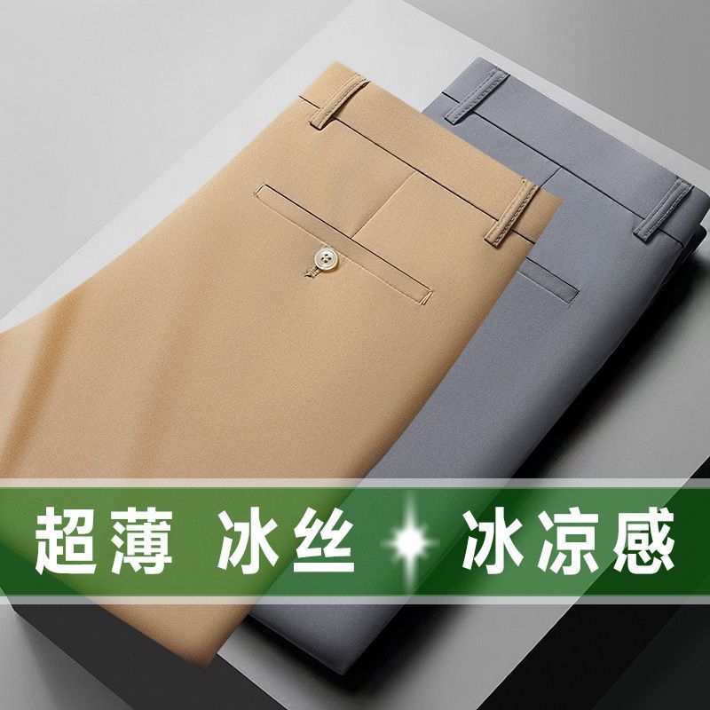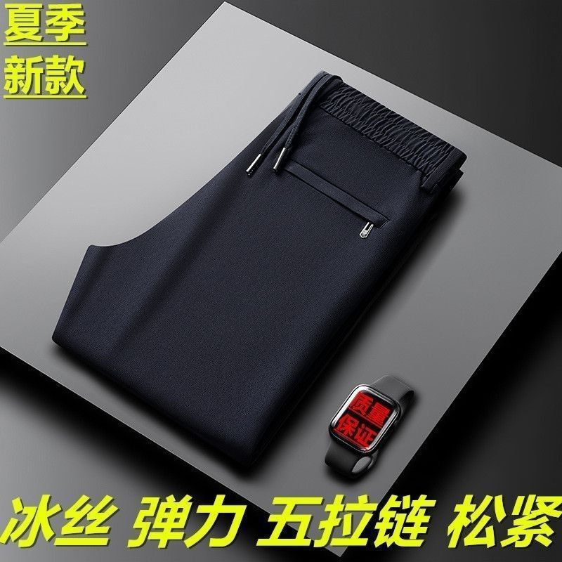 夏用の男性用ハイエンドアイスシルクカジュアルパンツ、男性用の薄い伸縮性ウエストパンツ、男性用のストレートレッグルーズビジネスノンアイロンパンツ