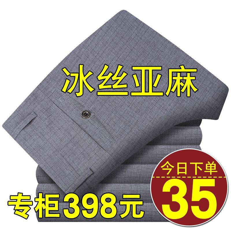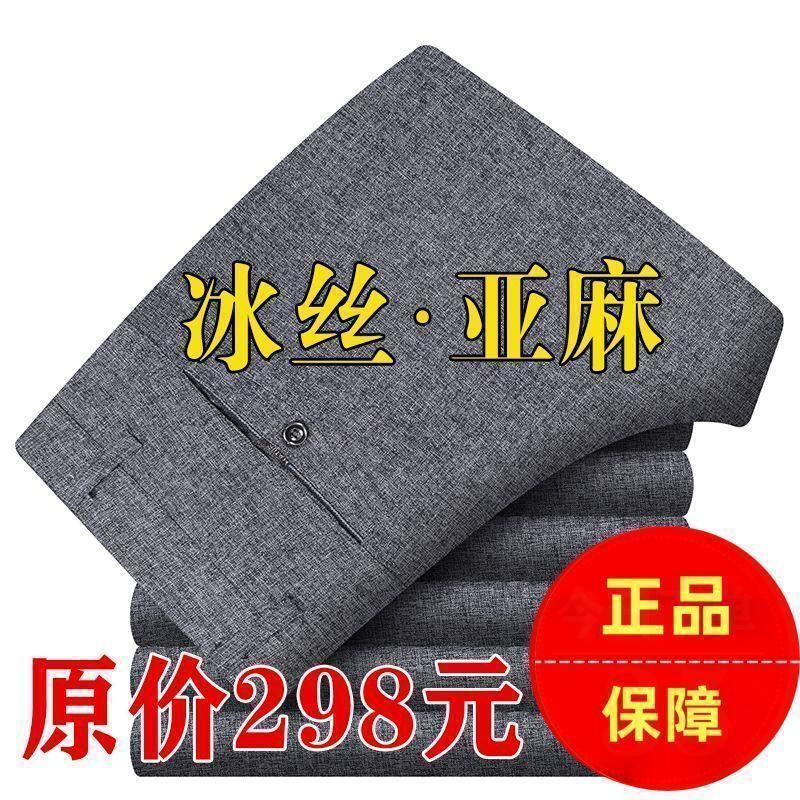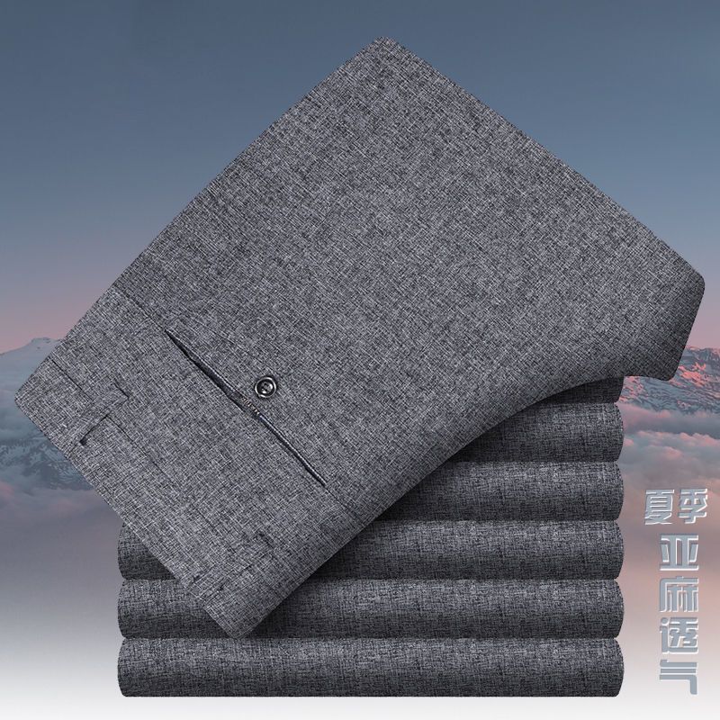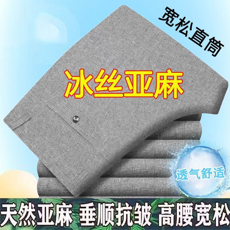 夏用薄手メンズアイスシルクリネン中高年カジュアルパンツノンアイロンパンツゆったり綿麻ストレートメンズパンツ