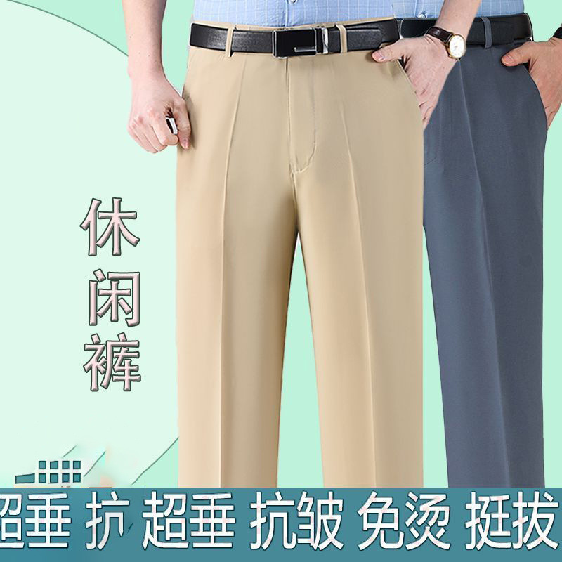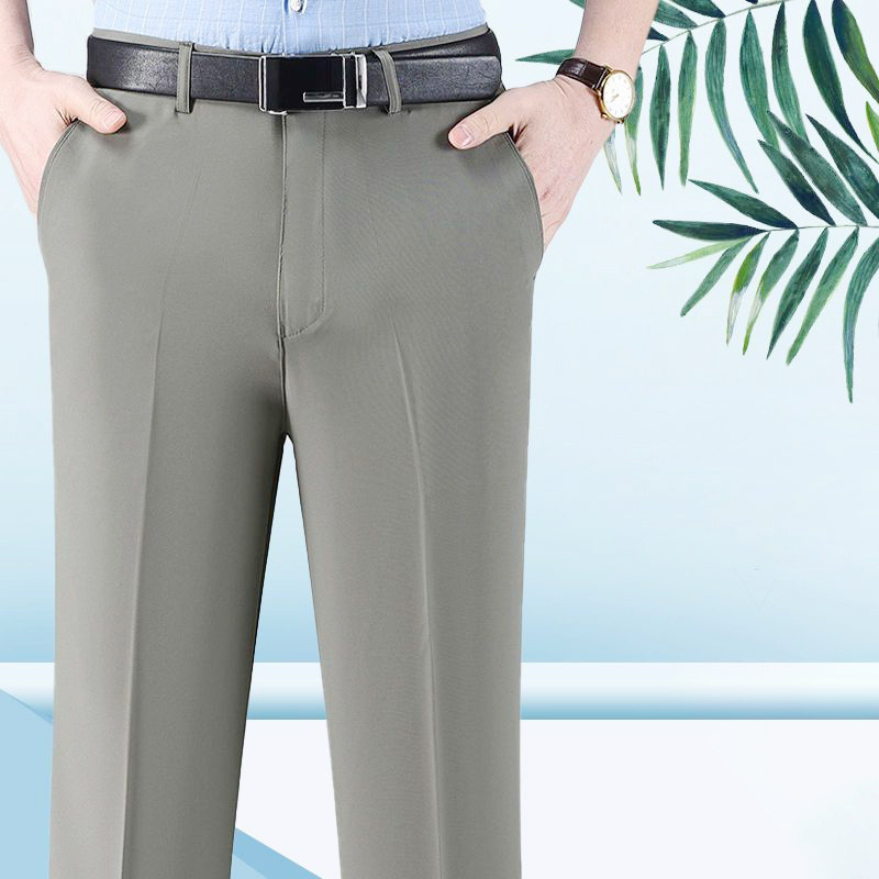 中高年男性向け夏用薄手ズボン、高級ドレープゆったりストレートメンズズボン、防シワ、ノンアイロンロングパンツ