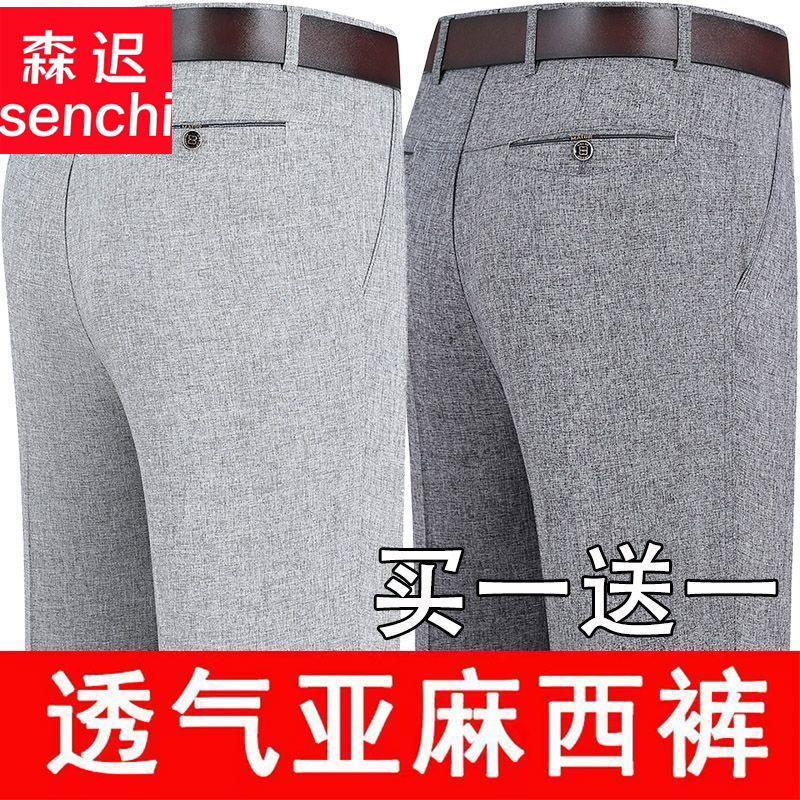 高級メンズパンツ、リネンパンツ、ハイウエスト夏用薄手中高年綿麻アイスシルクパンツ、ノンアイロンカジュアルパンツ、メンズストレートレッグルーズ
