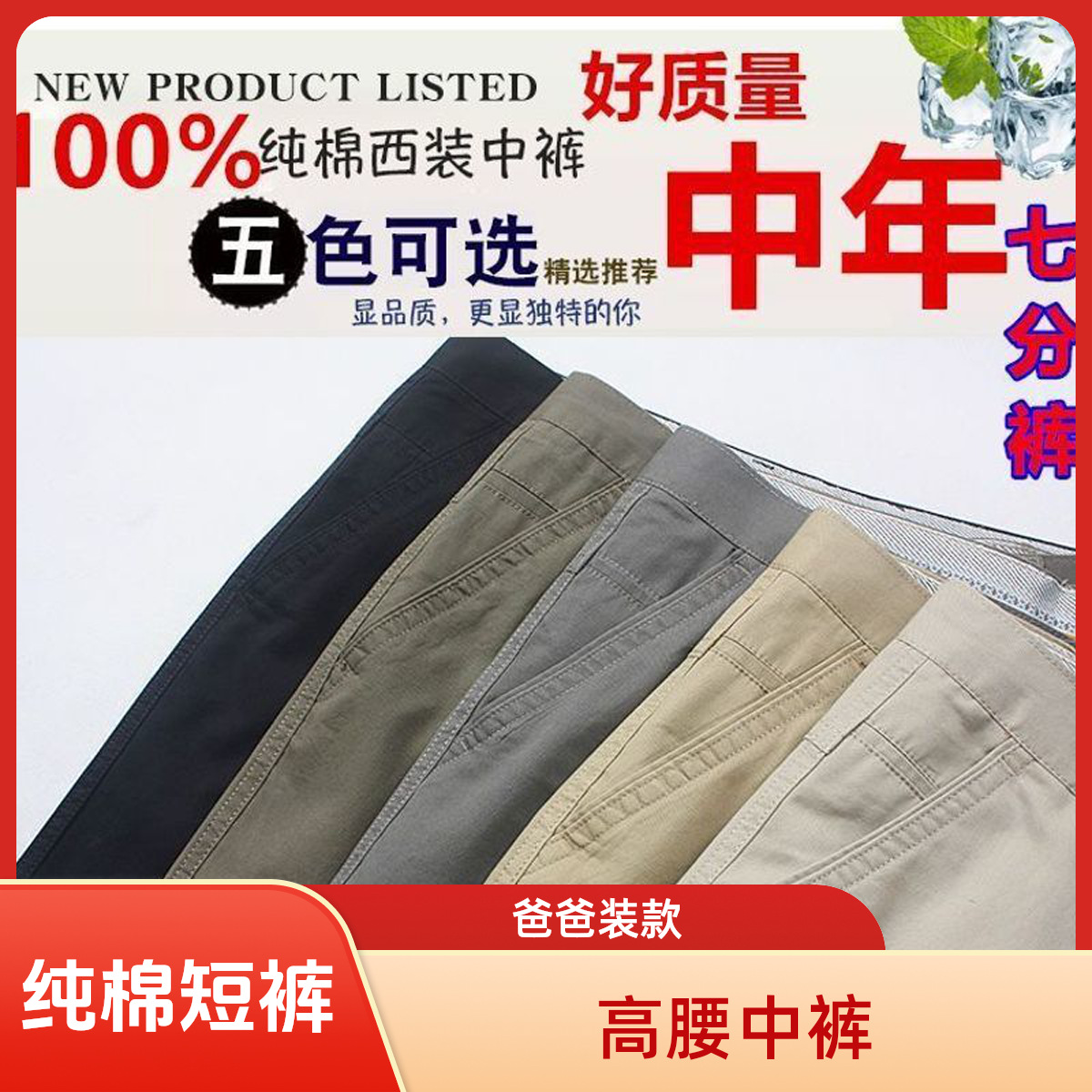 夏の純綿クロップドパンツカジュアルパンツお父さんハイウエスト中高年スーツショーツ7点新しい中国風メンズ薄手スタイル