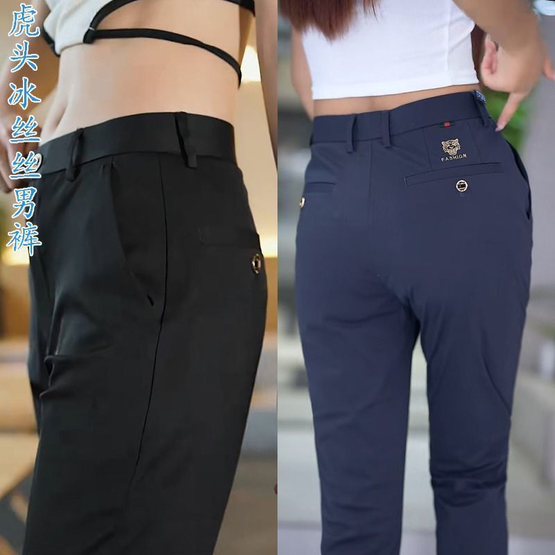 夏のメンズ薄いアイスシルク弾性高弾性ノーアイロンハイウエスト抗シワストレート刺繍タイガーヘッドカジュアルパンツ