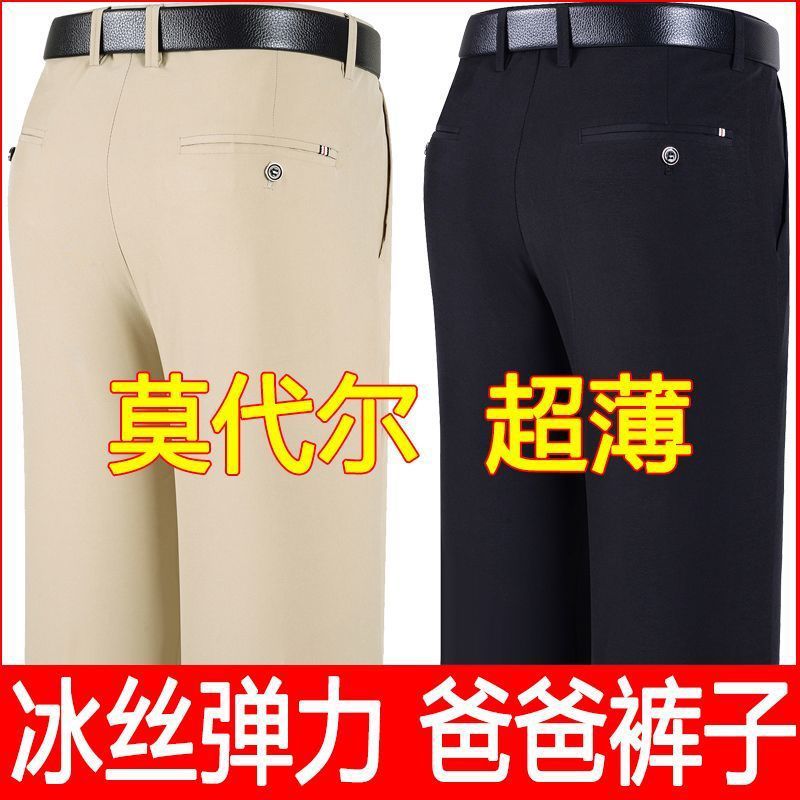 中高年男性向け夏用薄手ズボン、アイスシルク高級ドレープルーズストレートメンズズボン、防シワ、ノンアイロンロングパンツ