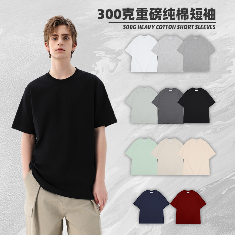 夏の紳士服300グラム重ポンド純色純綿丸襟tシャツゆったり版型半袖双紗潮牌T底シャツ