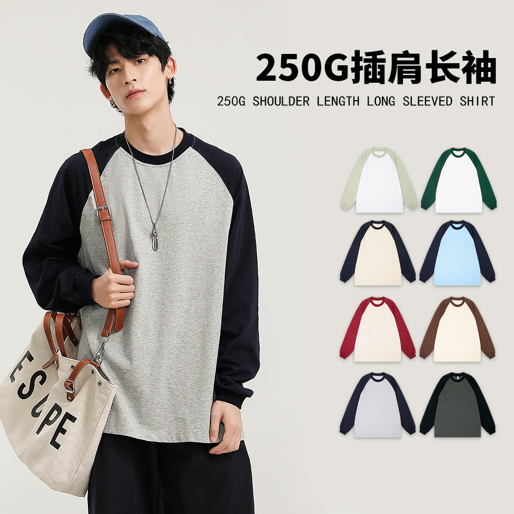250gの厚手の純綿両面生地、ラグランラウンドネックスウェットシャツ、トレンディなブランド、ゆったりとしたコントラストカラー、長袖、半袖、高重量純綿