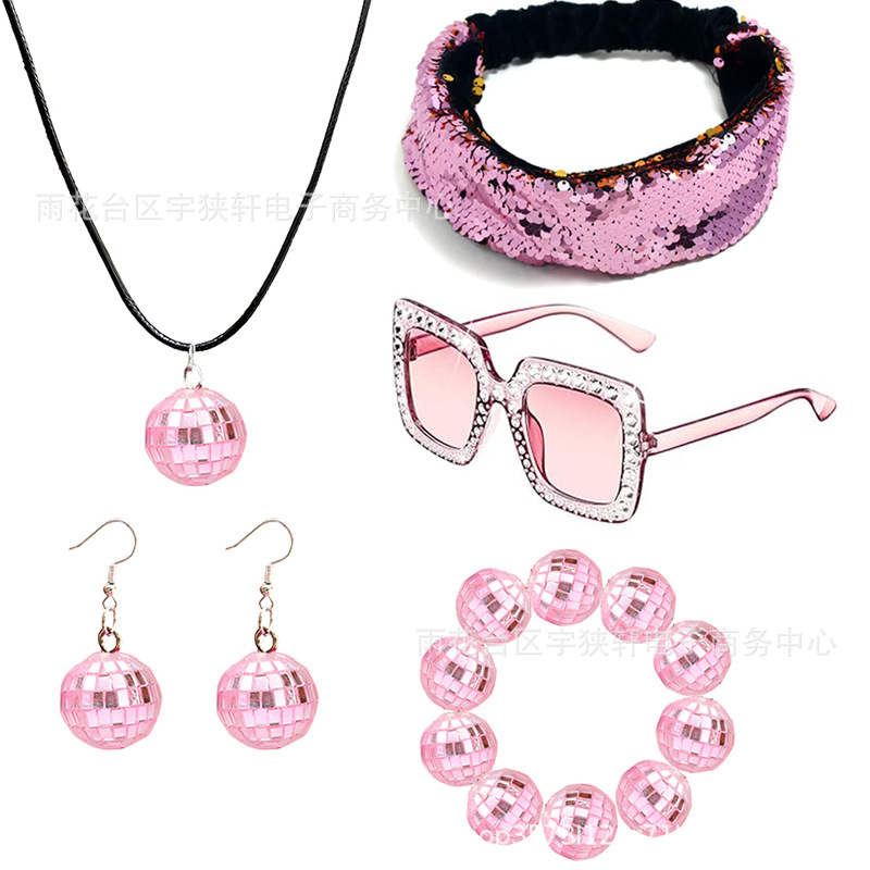 新しい70年代ディスコレーザーボールのネックレスのイヤリングのブレスレットのスパンコールのヘッドバンドのサングラスの装飾セット