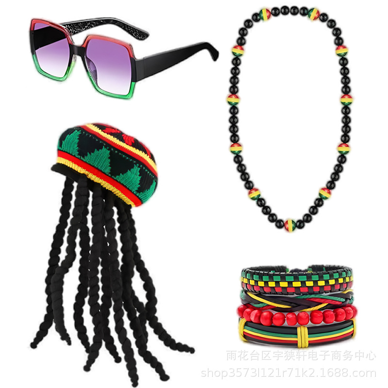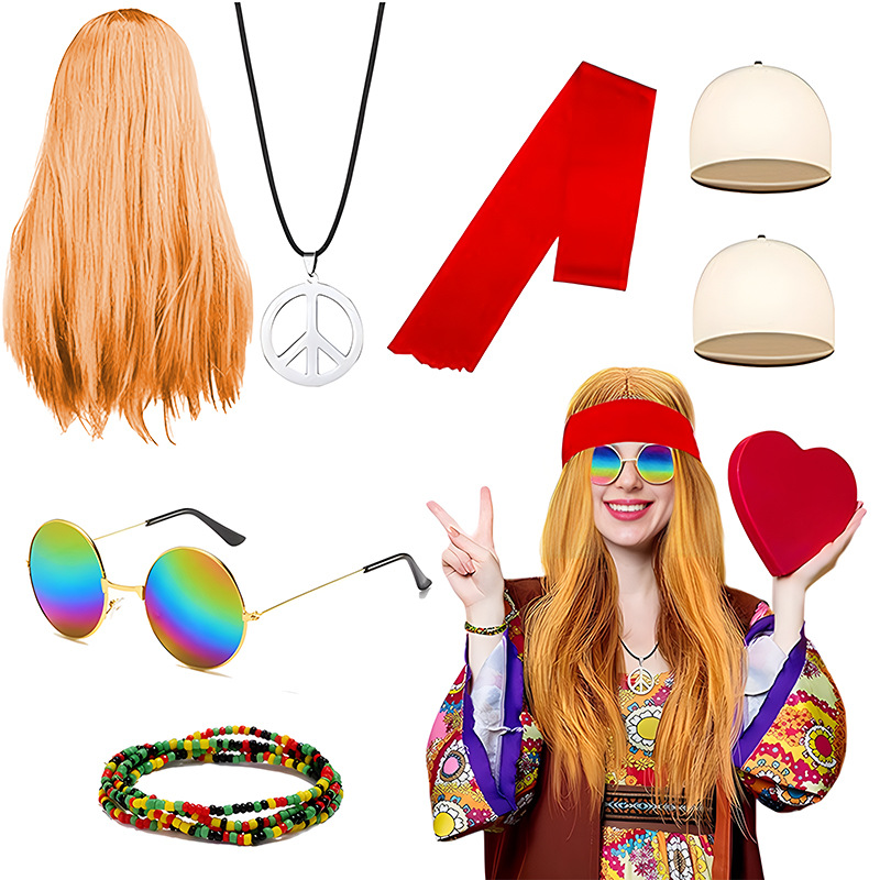 70年代ヒッピーかつらセットかつら平和マークネックレスサングラスブレスレット髪ネットと髪染めヘッドバンド