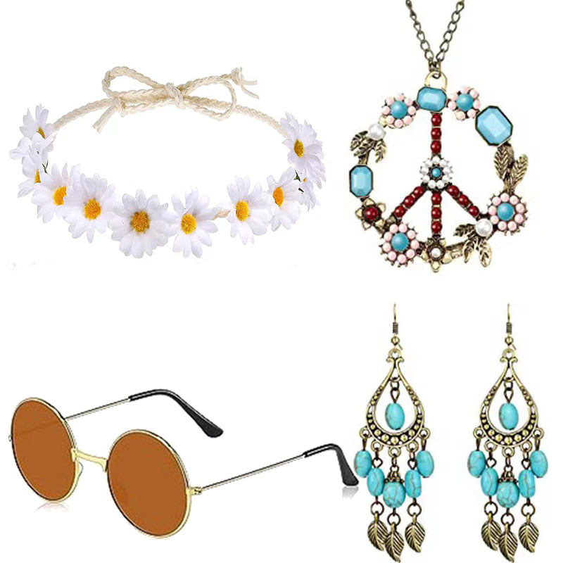 70年代ボヘミアンヒッピー風メガネ、ピースサイン、イヤリング、ネックレス、花輪、ヘッドバンドセット、ランウェイショー