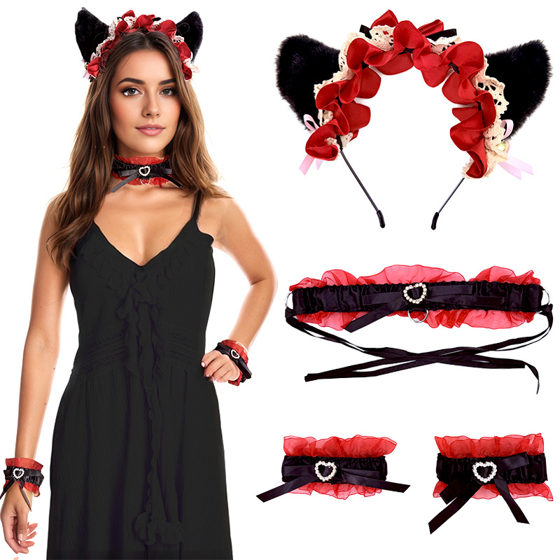 ハロウィーン猫衣装黒セットレース猫耳カチューシャ首輪手首帯動物ロールプレイングアクセサリー