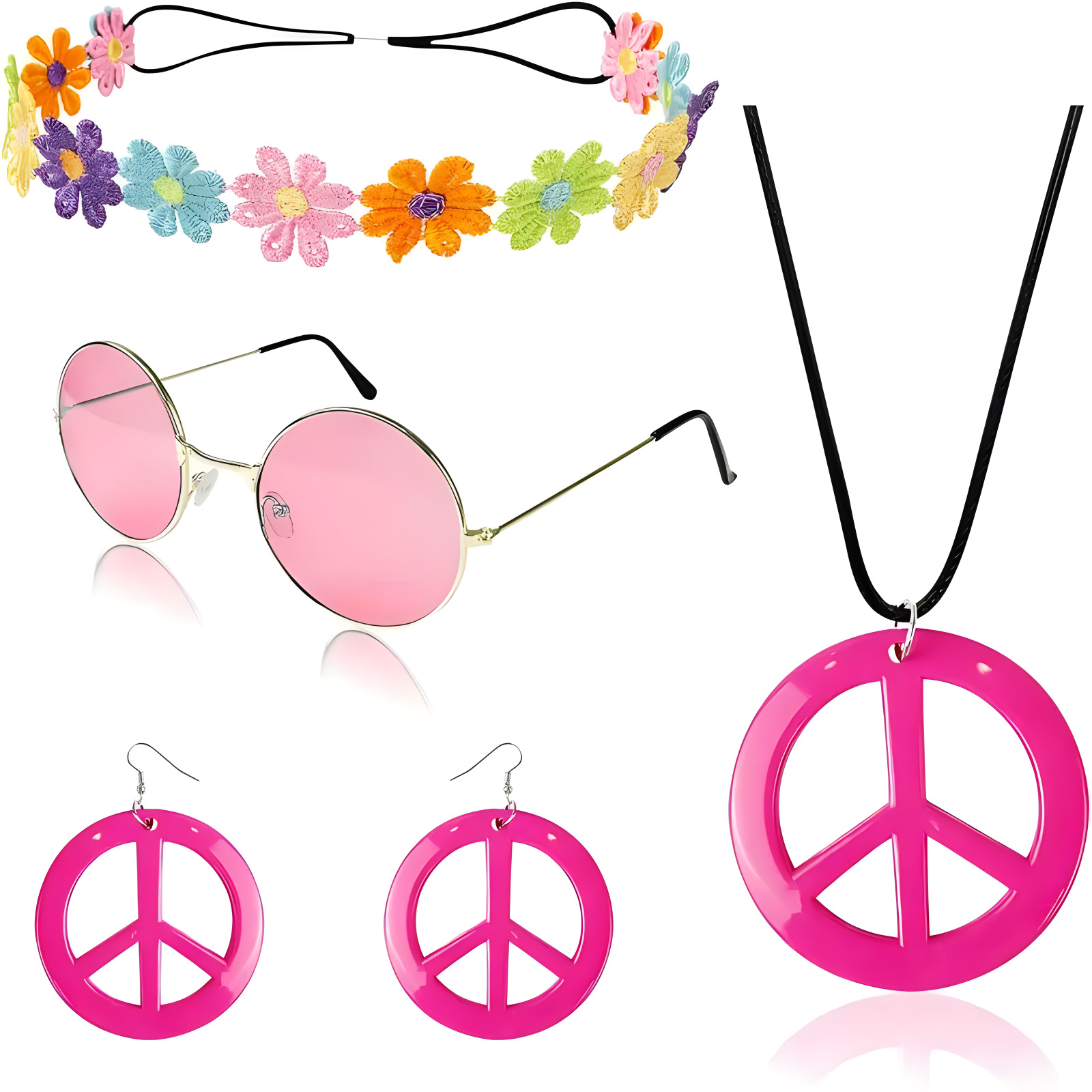 衣類アクセサリーセット、ピースサインネックレス、デイジーイヤリング、デイジーフラワーヘッドバンド、メガネ、ピーススタイルセット、レトロ