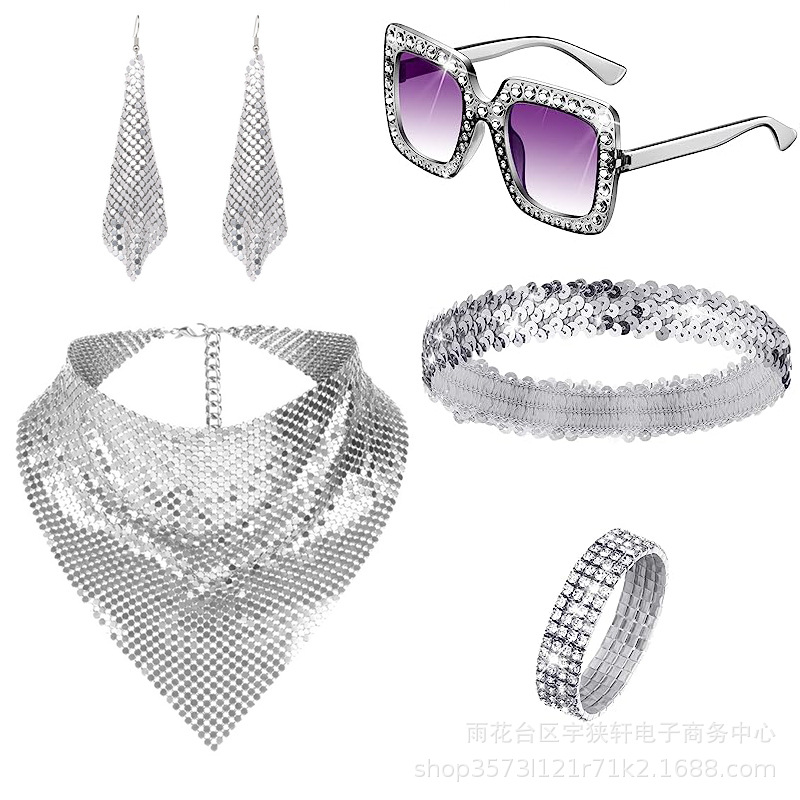 欧米の70年代のディスコの装飾のスパンコールの金属の三角のマフラーのイヤリングのサングラスのダイヤモンドのブレスレットのスーツ