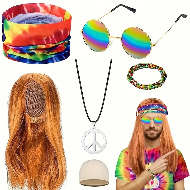 ハロウィンディスコカーニバルパーティー平和シンボルネックレスかつらパーティーセットヒッピーキットドレスアップ小道具