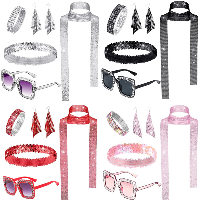 70年代ディスコアクセサリーレディース服スパンコールイヤリングブラジャーサングラスダイヤモンドブレスレットヘッドバンドセット