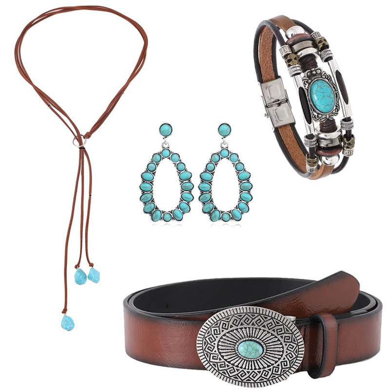 国境を越えたボヘミアターコイズのアクセサリーセット西部の女性カウボーイのネックレスのイヤリングのベルトのブレスレットの服装のアクセサリー