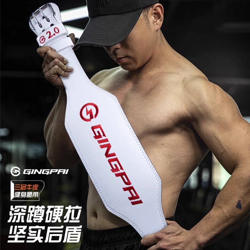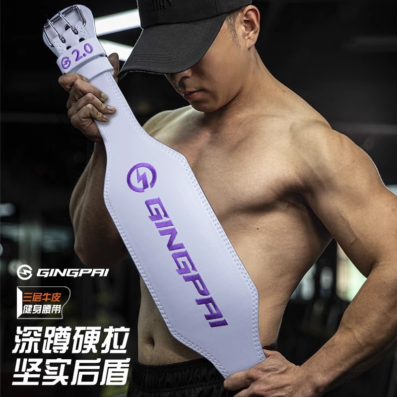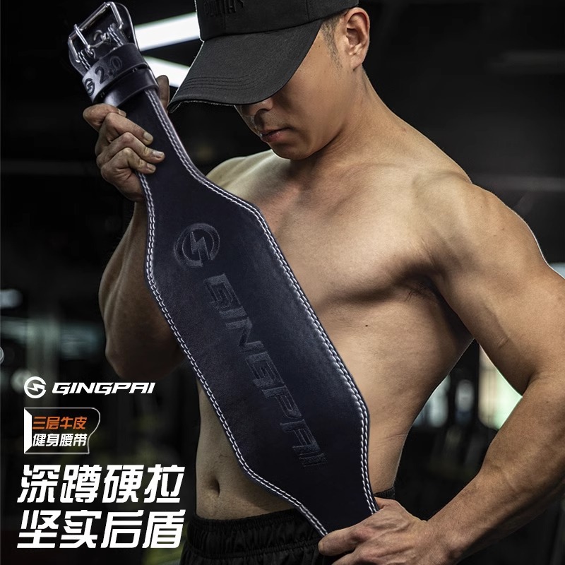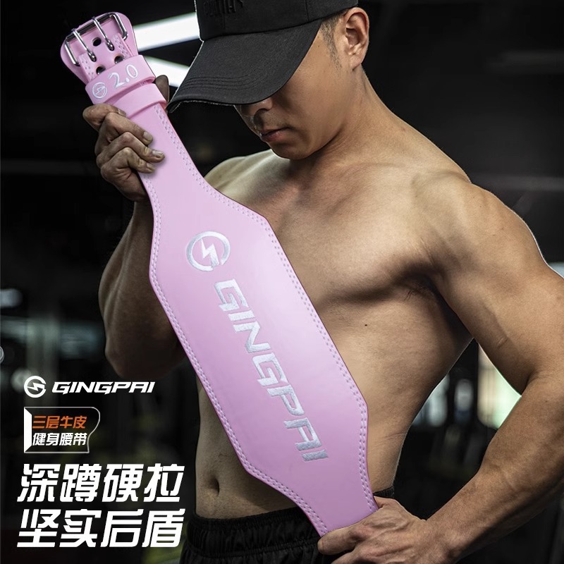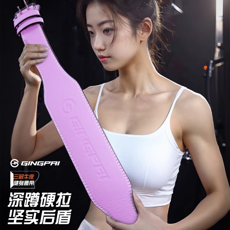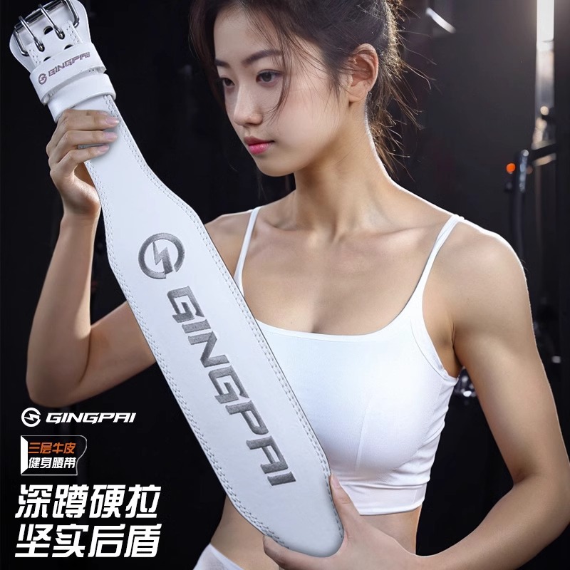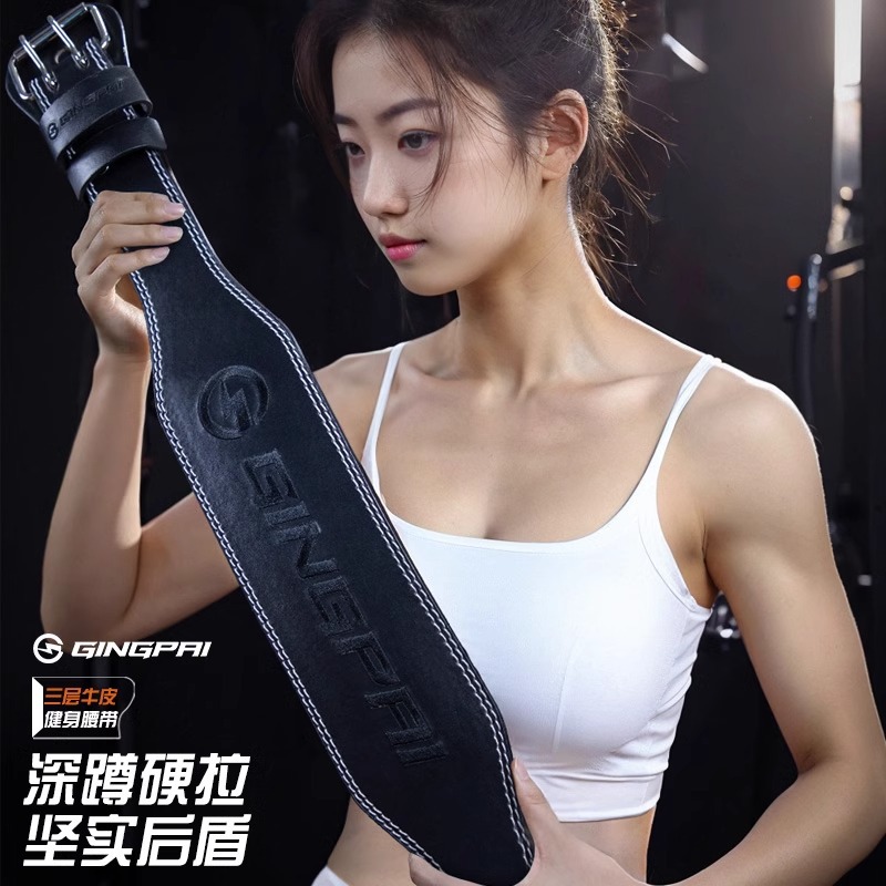 フィットネスのベルトの女性は深くしゃがみます。男性の力を上げて腰を保護します。