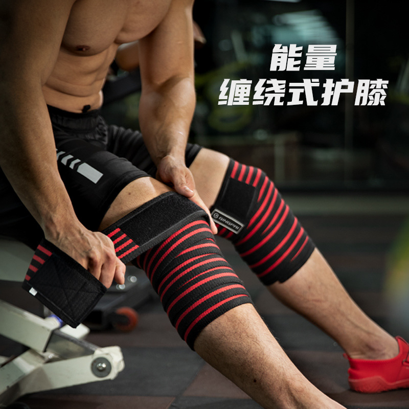 深くしゃがんで重量挙げをします。膝を保護します。弾力包帯を巻いて膝を縛ります。
