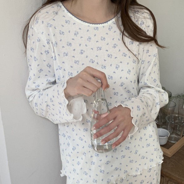 韓国ins女性ベアー蝶結び犬の花の縁の綿の頭の家の服のパジャマセットのウエストロープは調節できます。