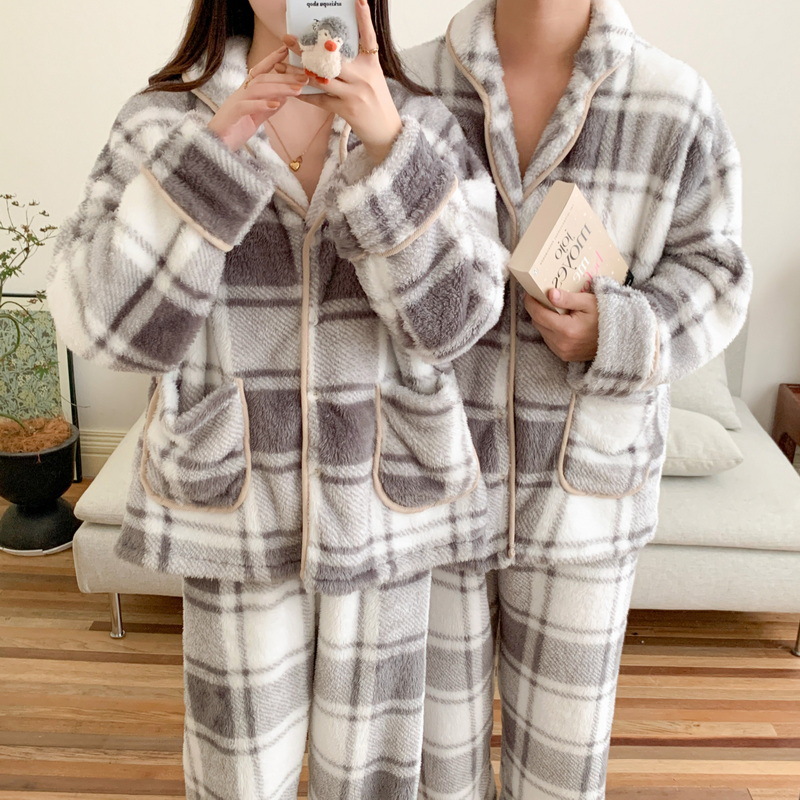 韓国chiレディース冬新作厚手毛羽立ち格子カップルパジャマセット長袖長ズボンホームウェアファッション
