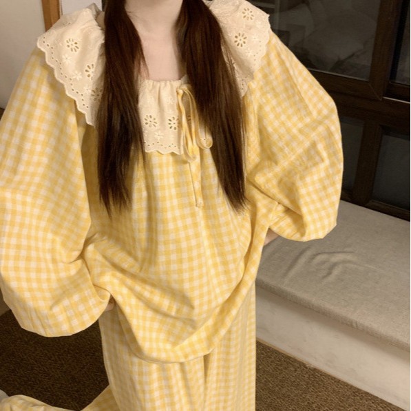 韓国ins女性秋の新しい韓国版ピンクの格子丸首レース長袖長ズボンパジャマセット卸売り