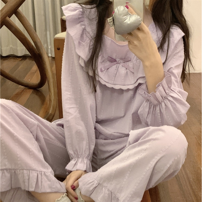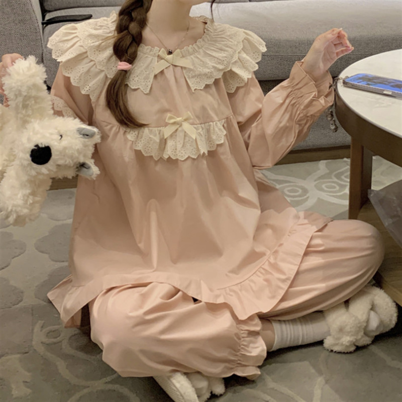 韓国ins女性春秋新韓版優しい枯れ感怠惰な花レースの縁襟ホームウェアのパジャマ