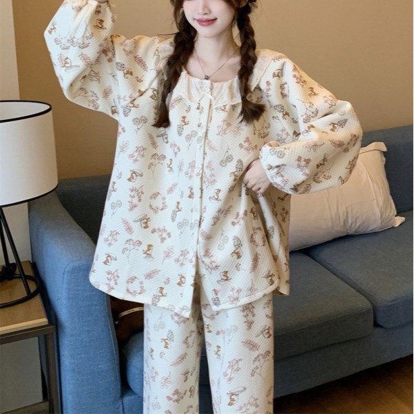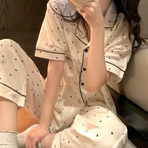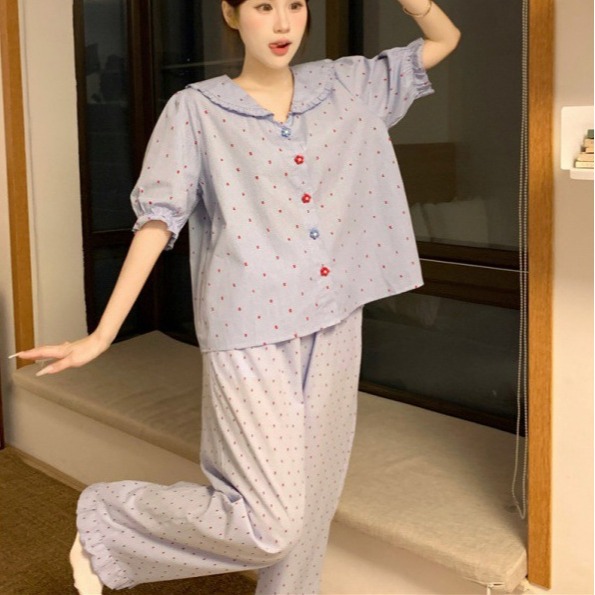 韓国ins韓国版甘い大襟かわいい花ボタンカーディガン半袖長ズボン長袖長ズボンパジャマカバー