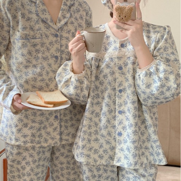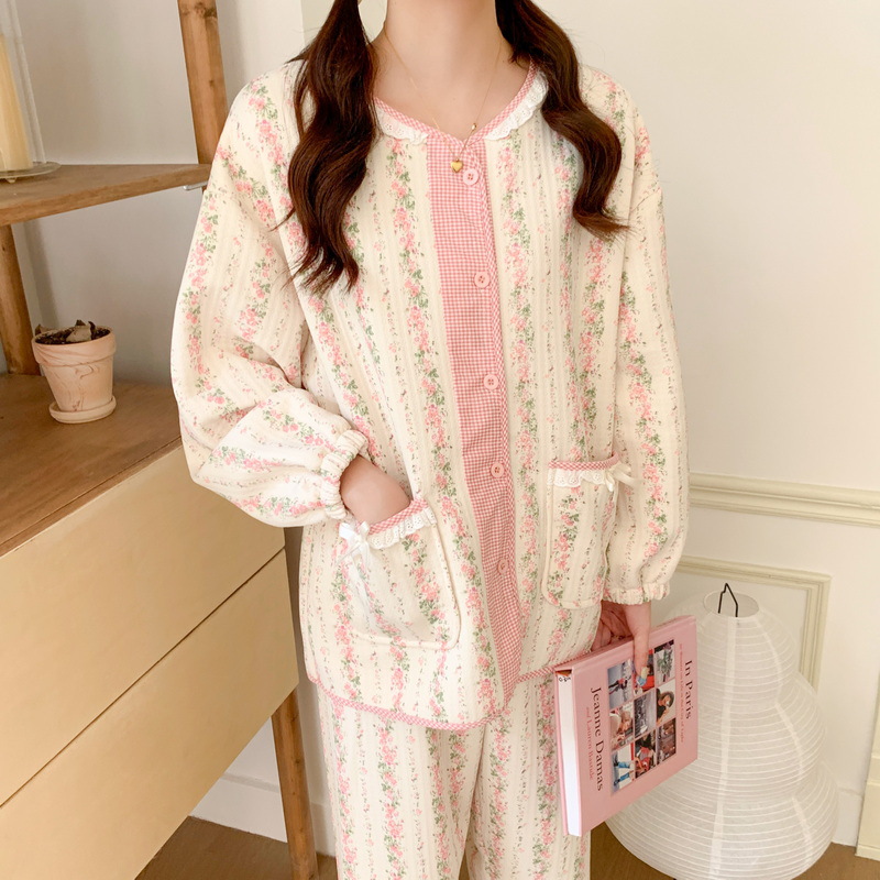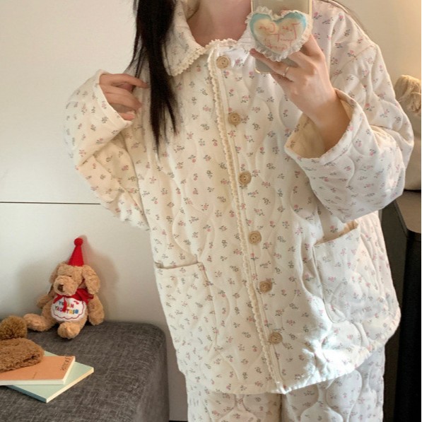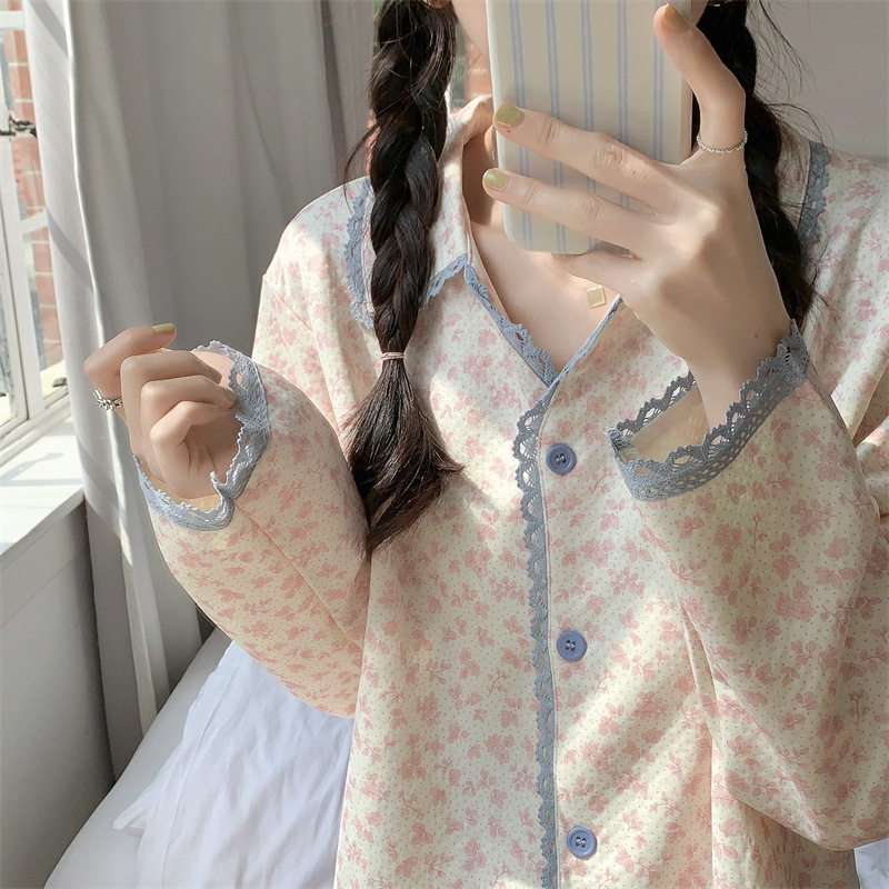 韓国インスタ厚手パジャマレディース韓国系優しい花柄シンプルで快適レーススーツカジュアルゆったりホームウェア