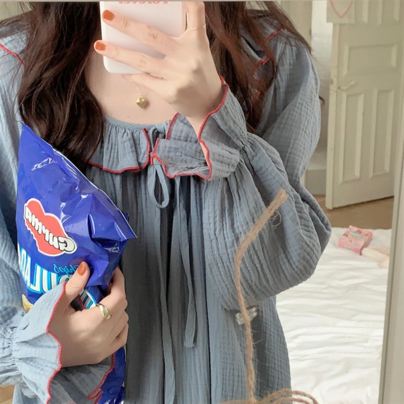 韓国ins女装2021春夏新品長袖ゆるい人形襟砕花家服パジャマ卸売り女装