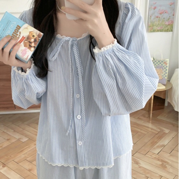 韓国インスタレディース新作パジャマレディース韓国系優しいストライプシンプルで快適レーススーツカジュアルホームウェア