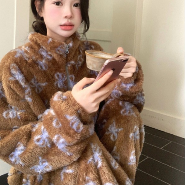 韓国ins女性秋冬新商品韓国版暖かい茶色の蝶結びの甘いぬいぐるみのパジャマセットの卸売り