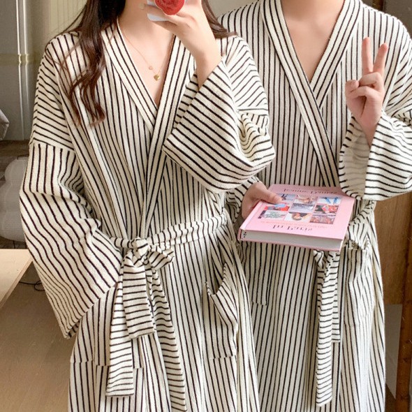 韓国インスタレディース春秋秋冬新作パジャマレディース厚手バスローブロング丈シンプルストライプホームウェアパジャマ