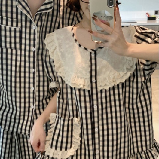 韓国ins韓国版甘いカップルシンプルな格子縞衝突色刺繍レース夏半袖カジュアルルームウェア
