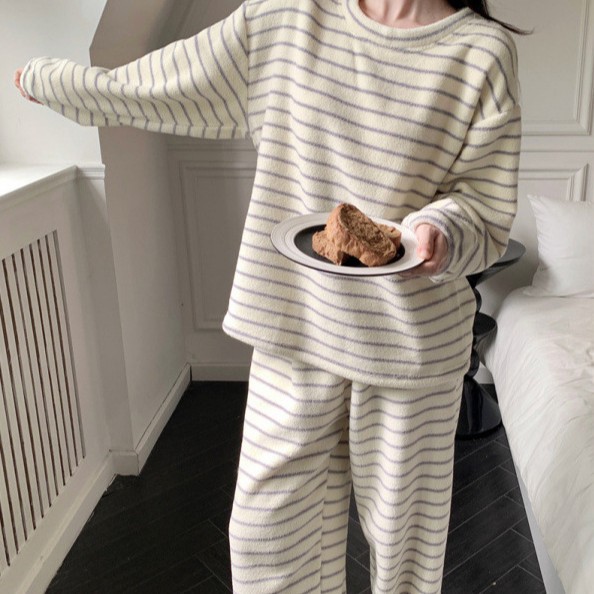 韓国insさん秋冬新商品韓国版シンプルストライプ保温柔らかいぬいぐるみパジャマセット女性