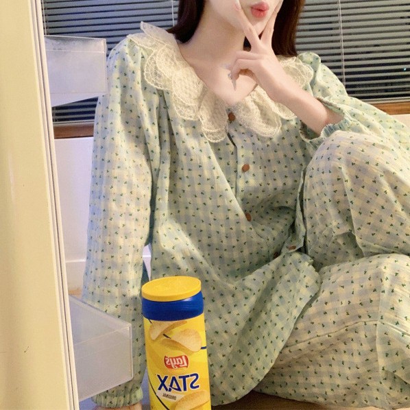 韓国insさん新商品韓国版甘格子小柄花レース襟長袖パジャマホームウェア春卸