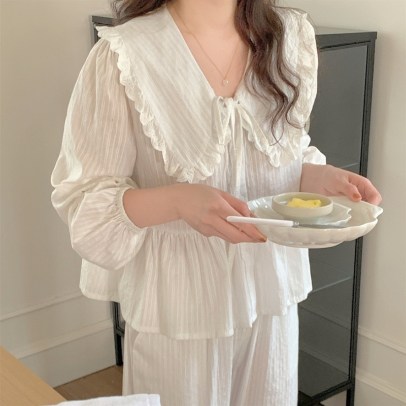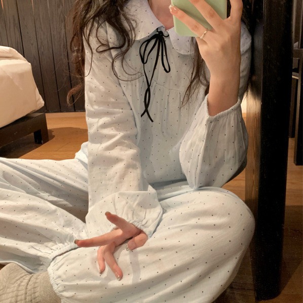 韓国ins女性春秋新商品韓国版甘い人形襟かわいい波点家庭服パジャマセット卸売り