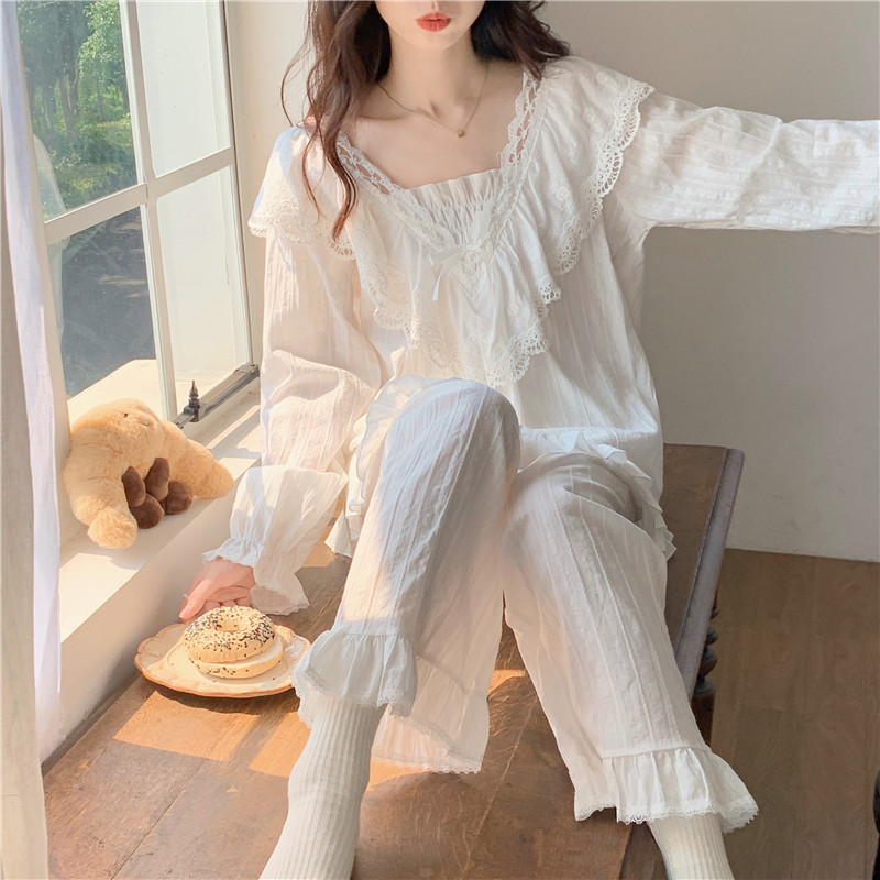 韓国ins女性秋新商品甘いレース姫風綿ジャカードホームウェア長袖パジャマセット