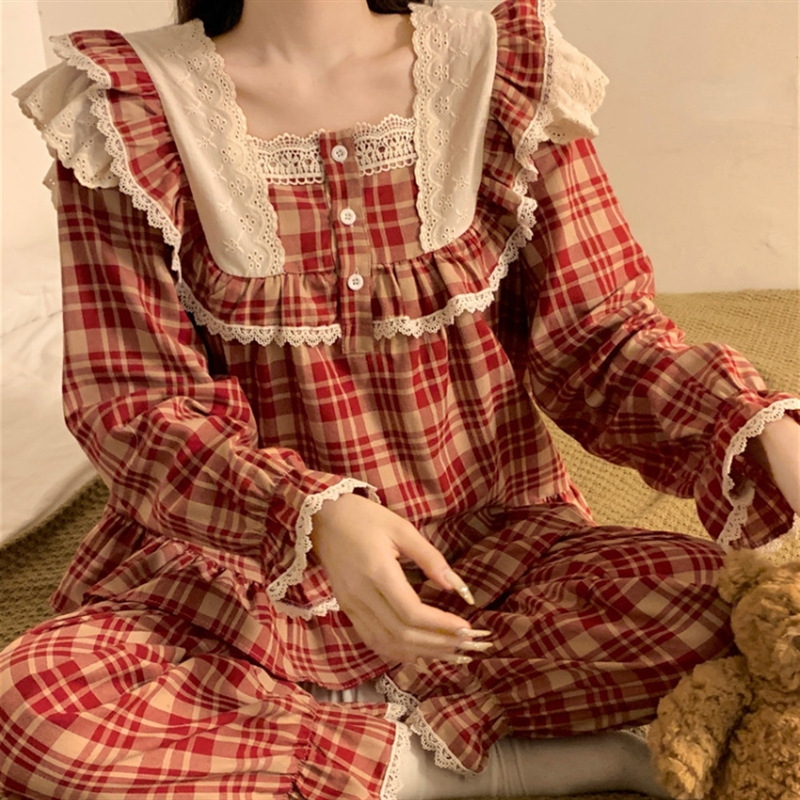 韓国ins女性外国貿易韓国版甘いレース宮廷風格子衝突色レースゆるいホームウェアセット