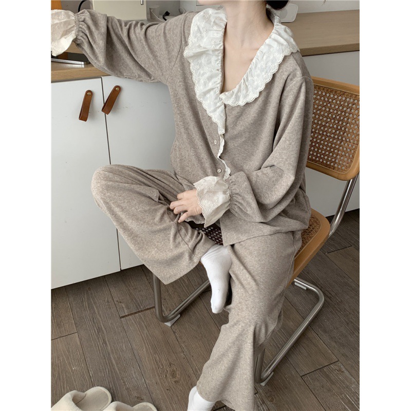 韓国ins女性外国貿易秋冬人形の小さい襟のかわいいレースは家庭服のパジャマセットをつなぎます。