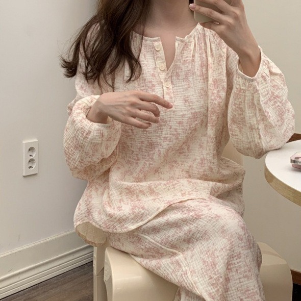 韓国ins女性フランス水墨プリント二重綿糸カバー丸首ゆるい家庭服パジャマセット女性
