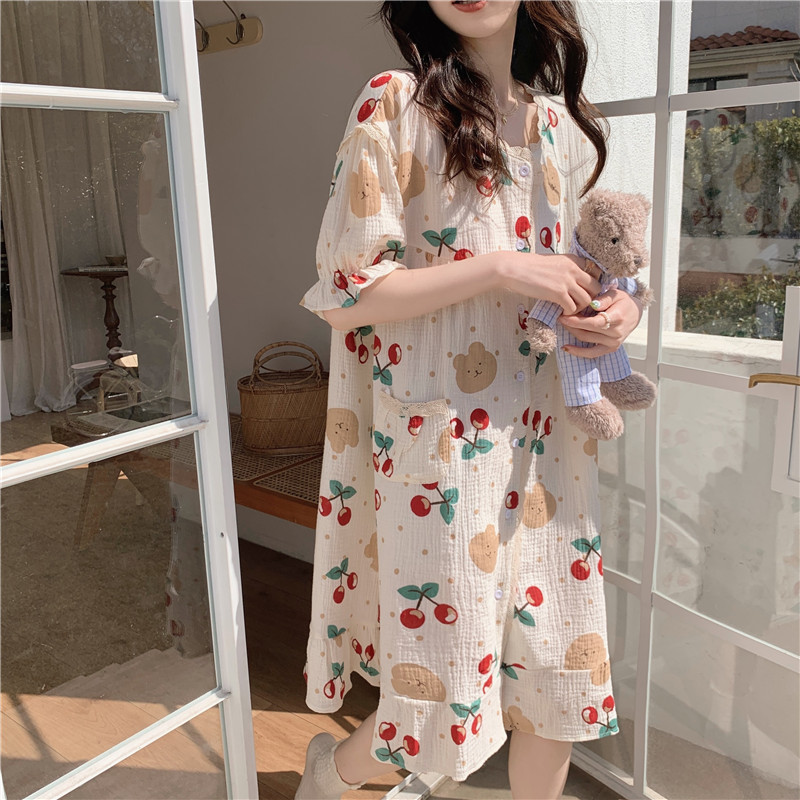 実拍2022韓国版綿糸かわいいさくらんぼレースの外着寝スカート半袖半ズボンセットファッション家服