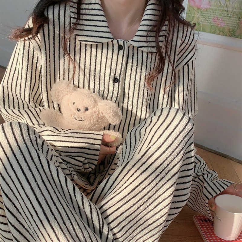 韓国ins女性冬新商品韓国風ストライプパジャマカジュアル長袖長ズボン保温ホームウェア女性服セット