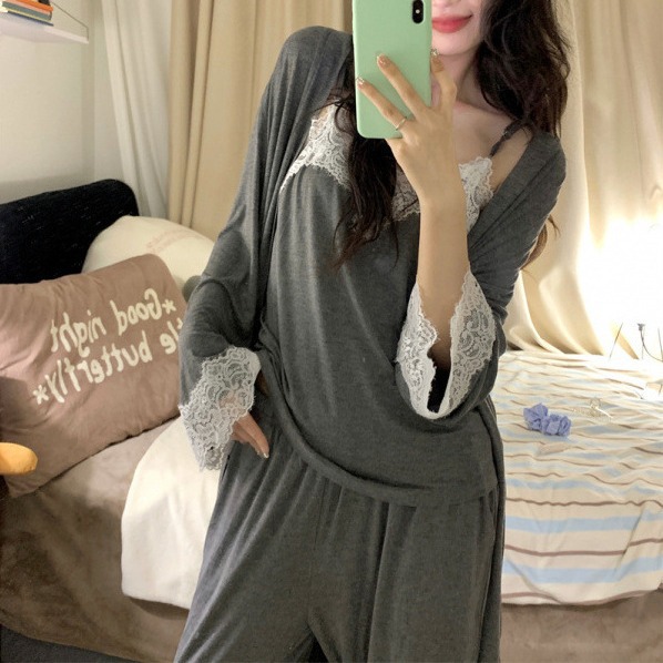 韓国ins女子春秋新小蝶結び弾力ニット三点セットホームウェアパジャマセット胸パッド付き