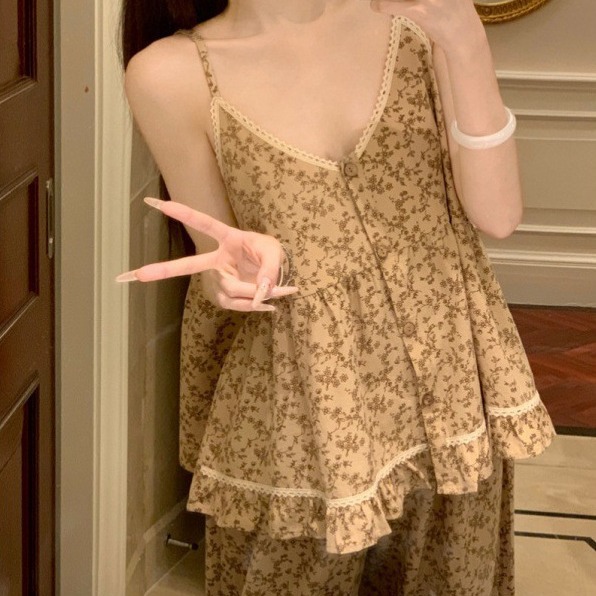韓国insさん夏の新商品韓国風ストラップパジャマ女性夏のズボン綿織ホームウェア2点セット女性
