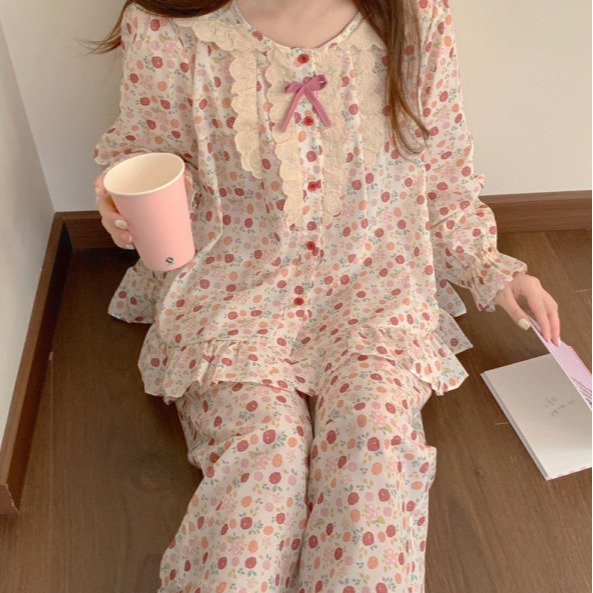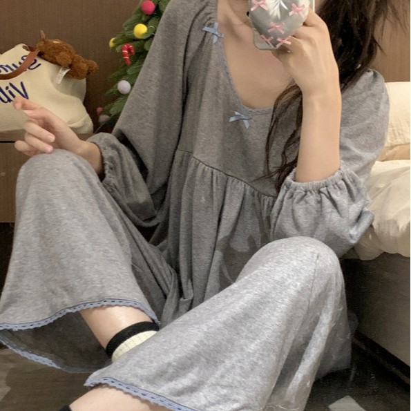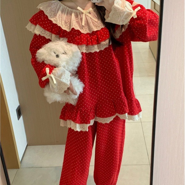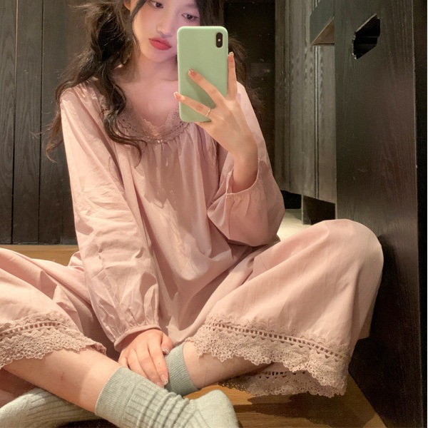 韓国ins女性韓国版カップルゆったりとした快適で甘い宮廷風春秋長袖長ズボンホームウェアセット