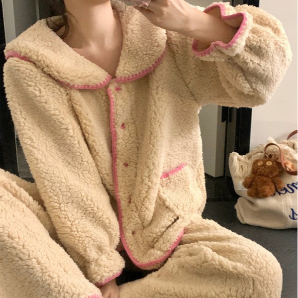 韓国ins女性秋冬女性かわいい人形襟サンゴベルベット韓国系甘い保温家庭服パジャマセット