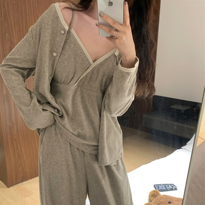 韓国ins女性対外貿易秋冬新商品韓国版vネックレースストラップ3点セットタオルパイル家服パジャマ