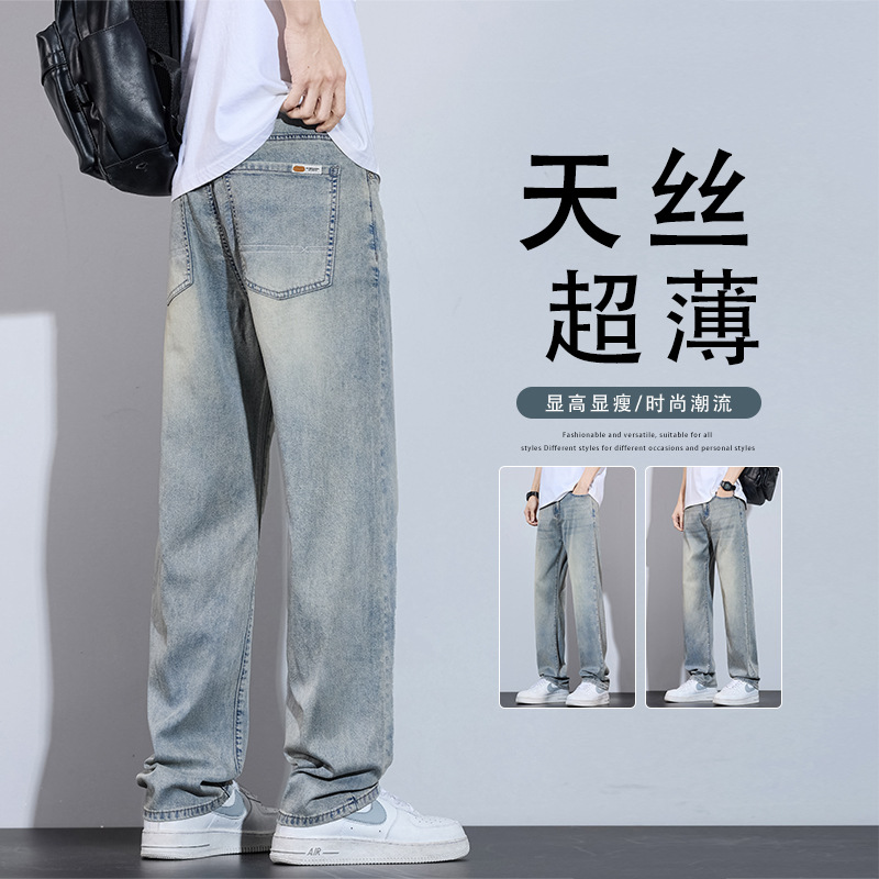 夏薄い9点ジーンズメンズルーズストレートパンツ2025春秋新作メンズカジュアルパンツ